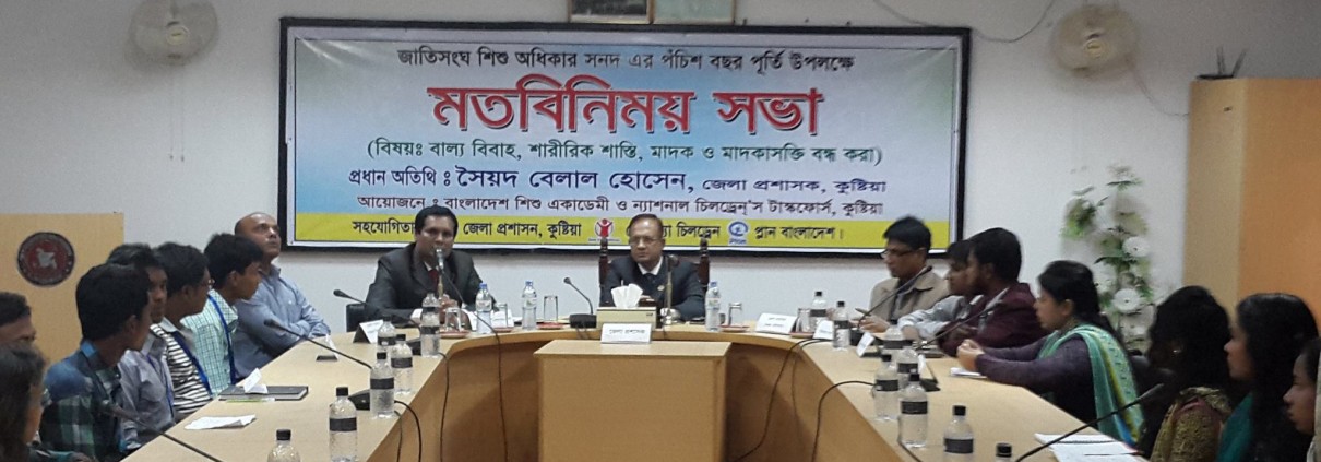 জাতিসংঘ শিশু অধিকার সনদের ২৫ বছর পূর্তি উপলক্ষে ৩০ নভেম্বর কুষ্টিয়ায় জেলা প্রশাসকের সভা কক্ষে অনুষ্ঠিত হয়ে গেল এনসিটিএফ কুষ্টিয়া জেলার মত বিনিময় সভা। বাংলাদেশ শিশু একাডেমী ও ন্যাশনাল চিলড্রেন্’স টাস্কফোর্স (এনসিটিএফ), কুষ্টিয়ার এর আয়োজনে এবং জেলা প্রশাসন, সেভ দ্য চিলড্রেন ও প্লান ইন্টারন্যাশনাল এর সহযোগিতায় ৬৪ জেলার ন্যায় কুষ্টিয়াতেও অনুষ্ঠানটি আয়োজন করা হয়।